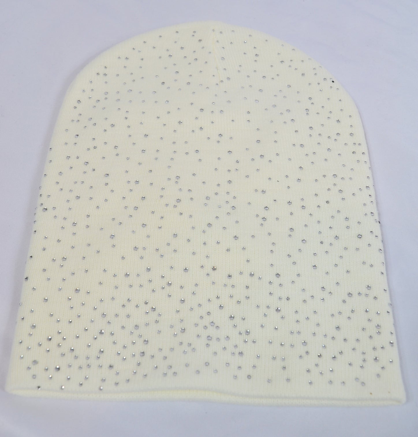 Stay cozy and chic with this cream white beanie, adorned with delicate rhinestones scattered across the surface for a subtle touch of sparkle. Perfect for adding a hint of glamour to your cold-weather wardrobe, this beanie combines style and functionality effortlessly.
