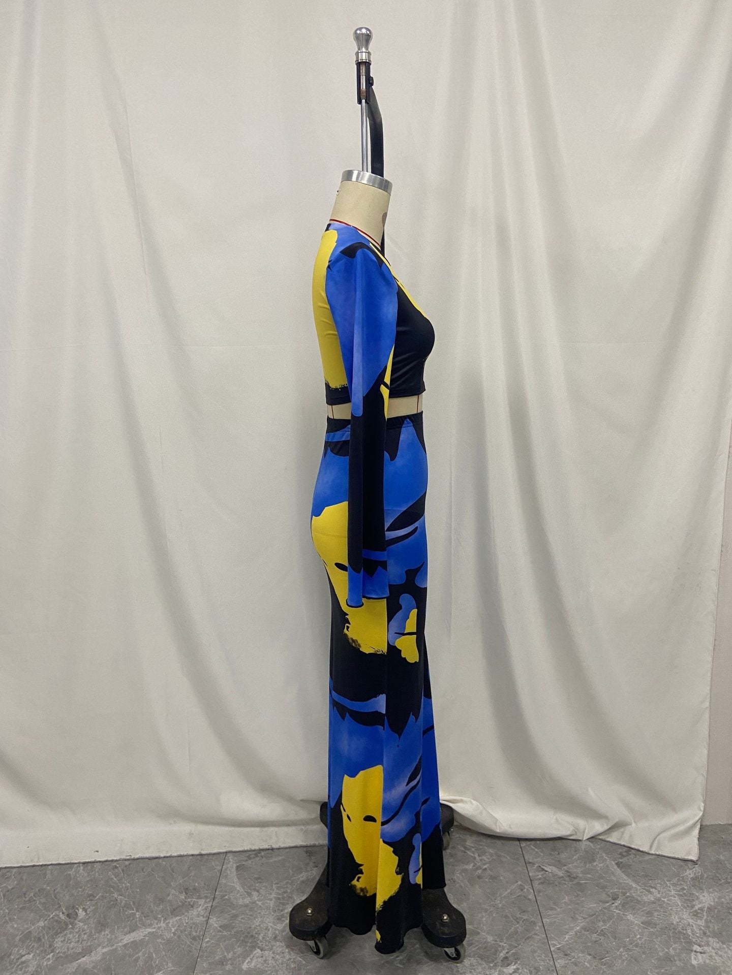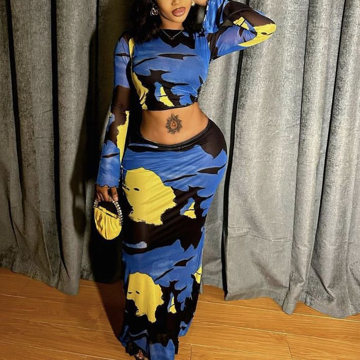 Print Long Sleeve Crop Top with Slim Fit Sheath Skirt Set