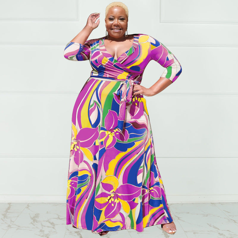 Summer Floral Print with Belt Loose plus Size Women Clothing Dress