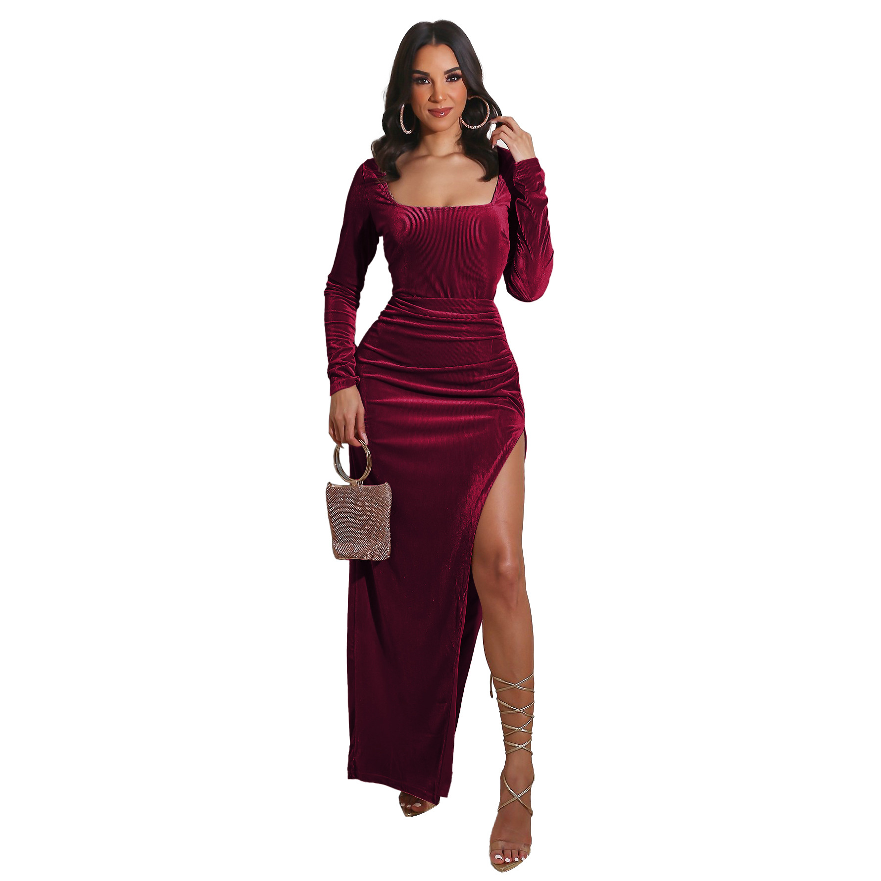 Women Clothing Autumn Winter Sexy Square Neck High Slit Pleuche Dress Evening Party Dress