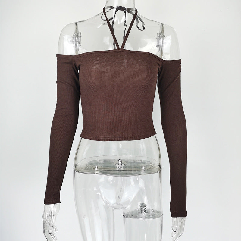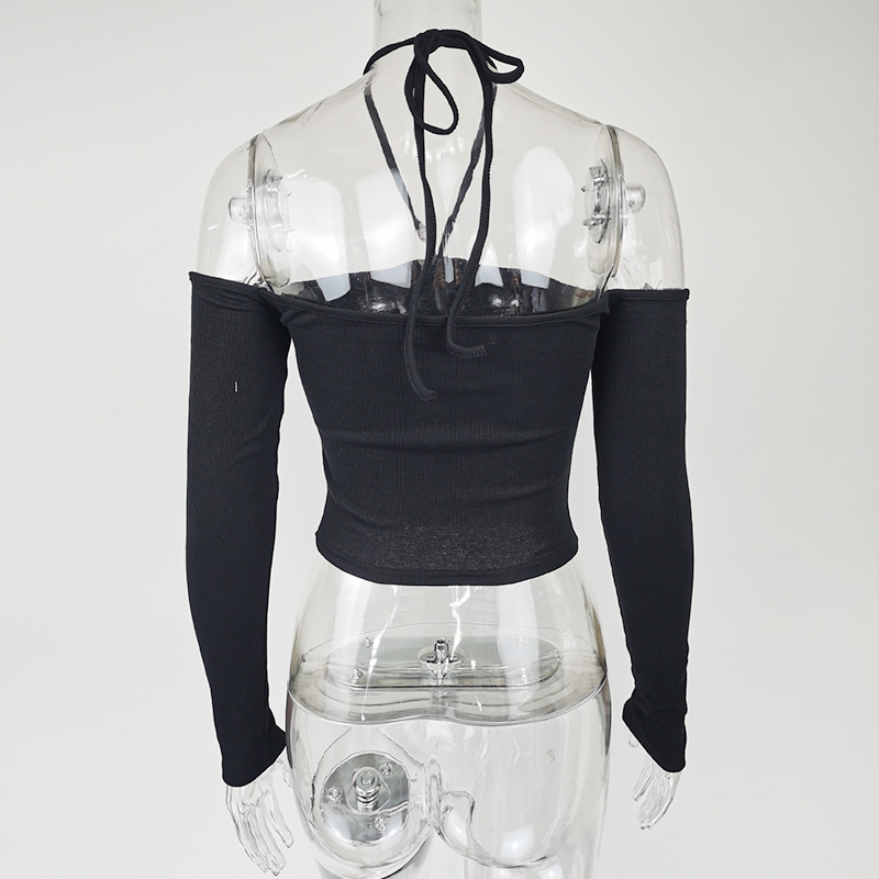 Women Sexy Slim Fit Lace up Sexy Top off Shoulder Halter Rib Long Sleeve T shirt